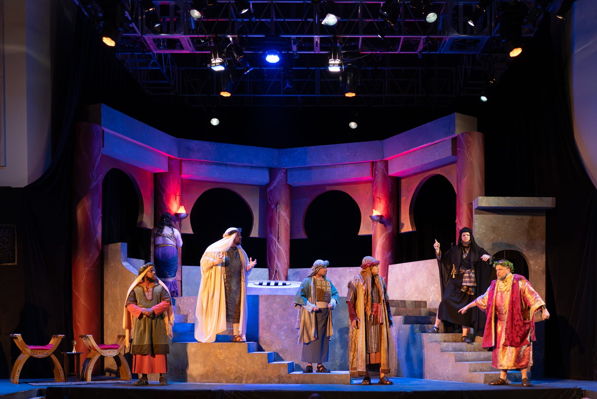 Will Upham’s clear and precise tenor gives the neurasthenic Herod enough weight to come across as bizarre without being comical. That leaves the comedy where it belongs—in the hands and finely blended voices of the five Jews: Zachary K. Devin, Thomas M. Taylor IV, David Morgans, James Stevens, and Fitzgerald St. Louis. Their increasingly strident debate over their firmly held and mutually exclusive ideas about God provide the closest thing to comic relief in the opera.